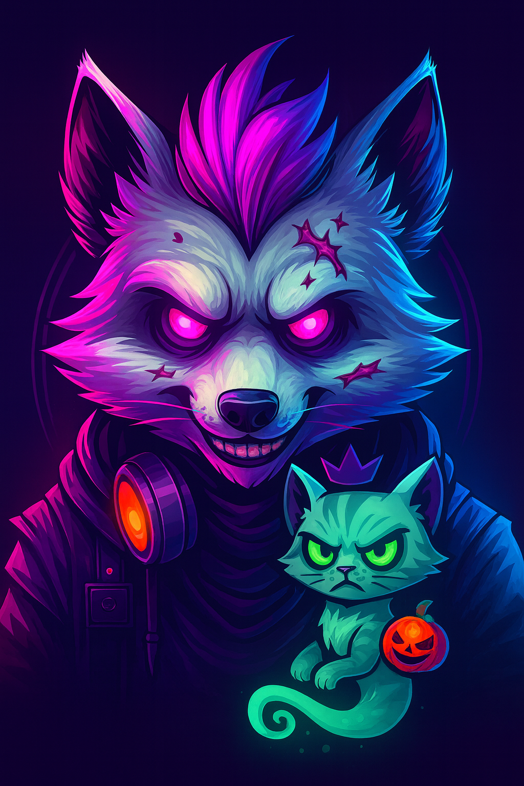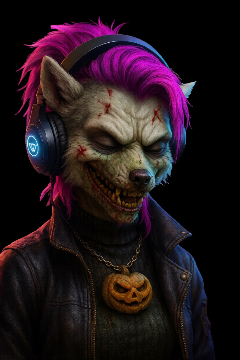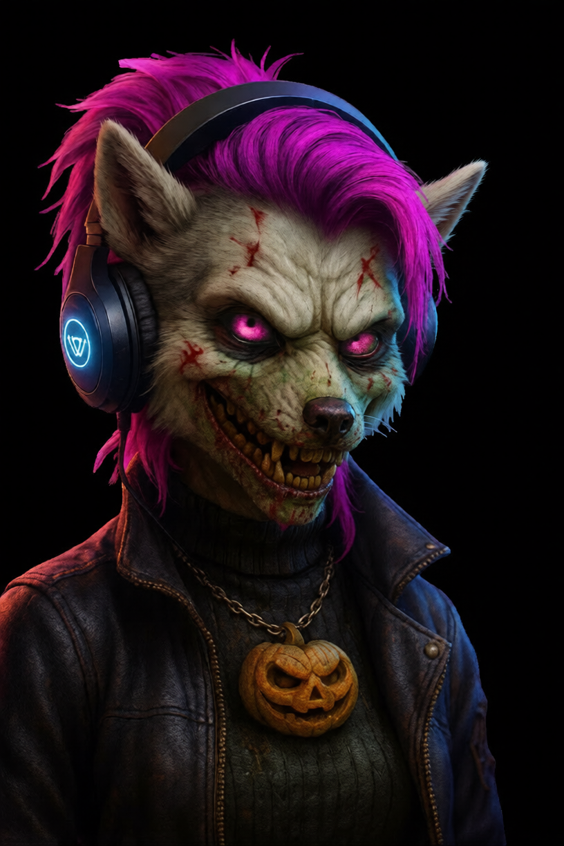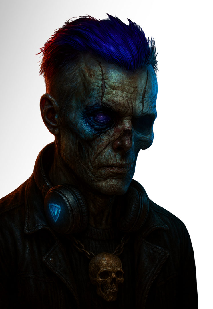 This section highlights AI‑generated character art, music visuals, and digital branding built around the Sarcastik Zombie identity. From persona concepts to album covers and neon channel banners, each piece explores how AI shapes style, mood, and storytelling across different formats. The music elements in this collection were created using Suno, adding another layer of AI‑driven creativity to the overall worldbuilding.